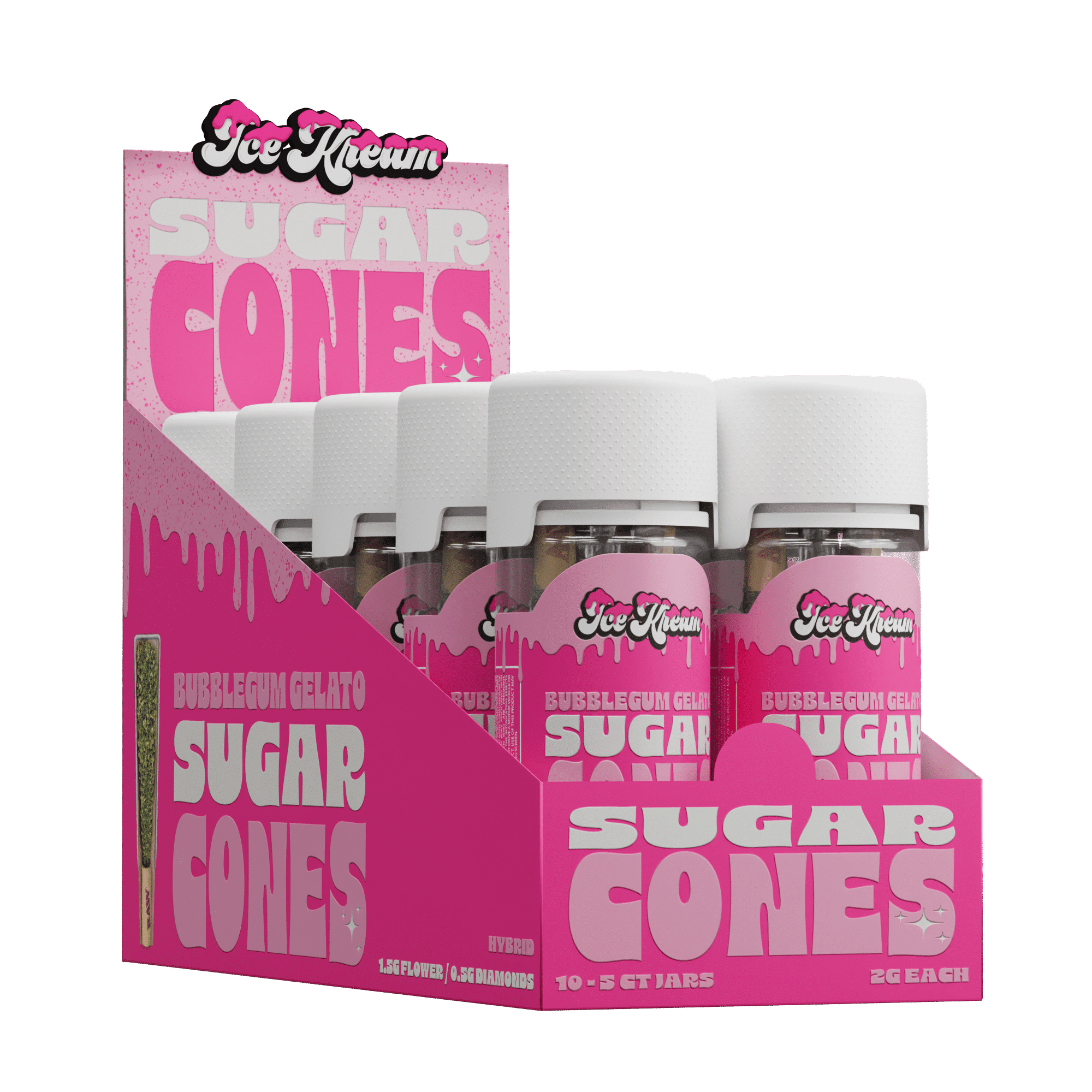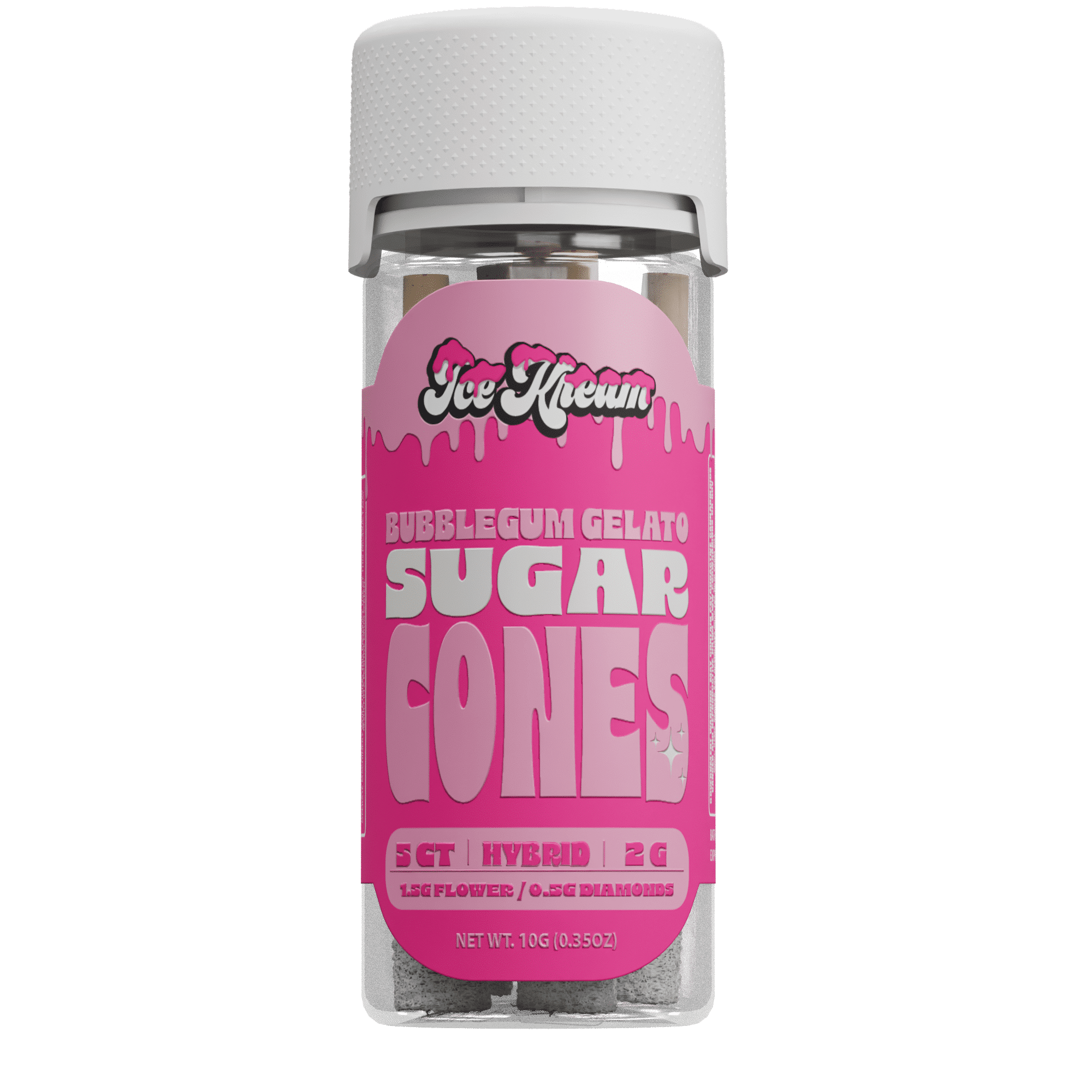 Unwrap the flavor. Bubblegum Gelato Sugar Cones by Ice Kream take you straight to the candy shop — no wrapper needed. This 5-pack of 2g diamond-infused THCa prerolls is loaded with premium exotic flower, then coated in a sticky layer of sugar concentrate for that extra pop of power.