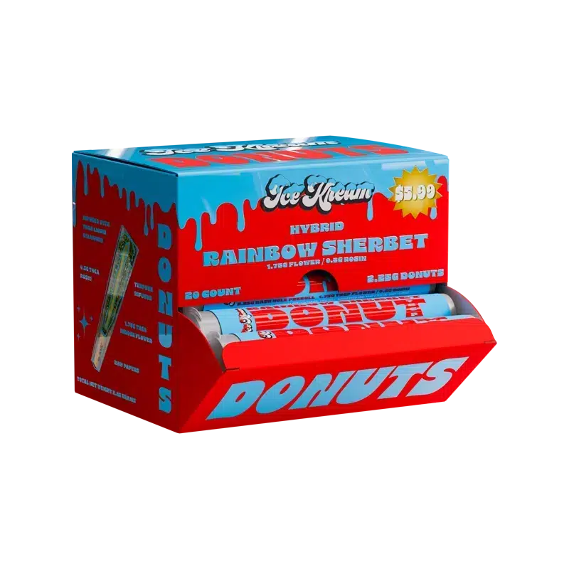 Colorful, creamy, and cold with a kick—Rainbow Sherbet Donut Hole blends flavor and fire in every hit. Rolled with 1.75g of premium THCa flower, infused with a .25g core of terp-rich Live Rosin, and wrapped in a smooth hemp cone, this preroll delivers a multi-layered smoke that’s as loud as it is tasty.